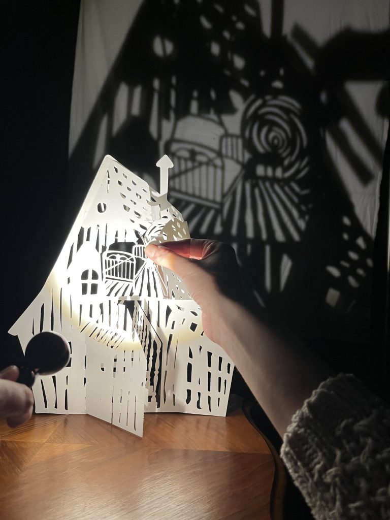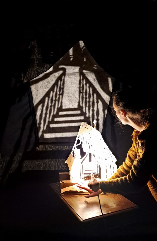 En juin et septembre 2024, les premières bases ont été posées en résidence de recherche et construction au Manipularium, pôle marionnette d’Essonne. Elaboration de la dramaturgie et de la scénographie, conception des masques et du costume, mise en place des premiers tableaux d’ombre…